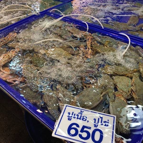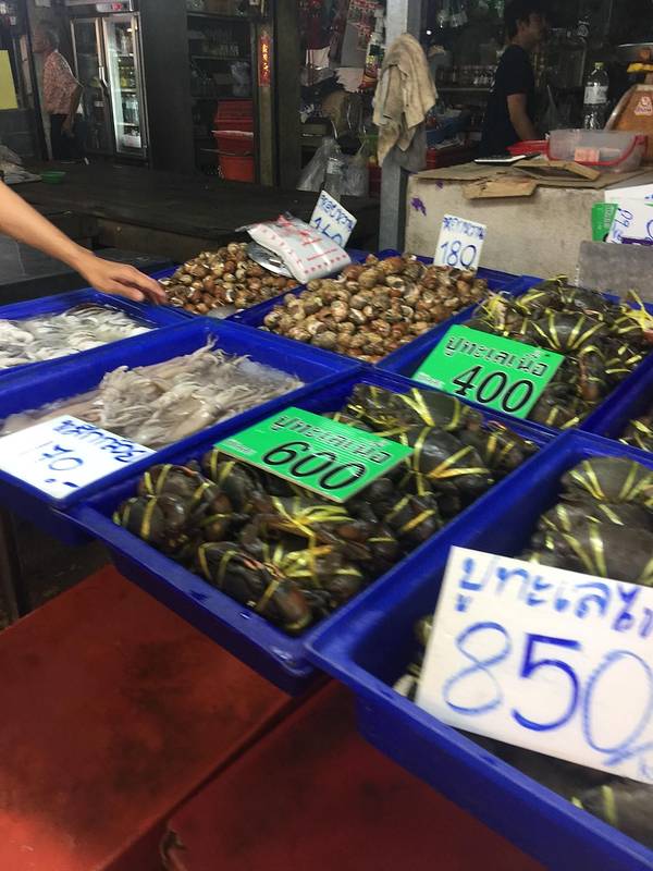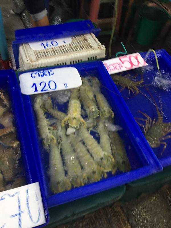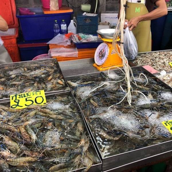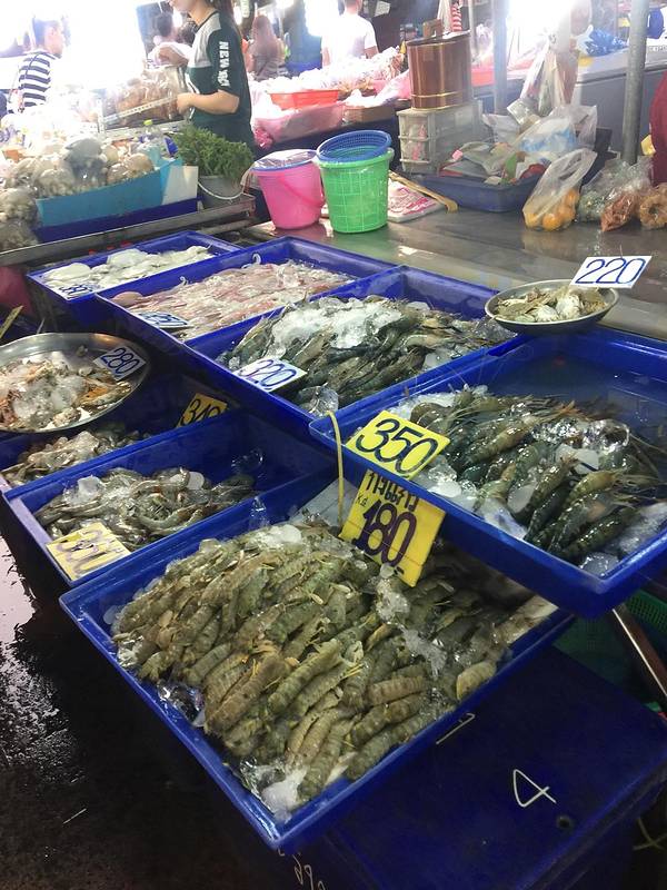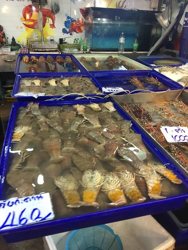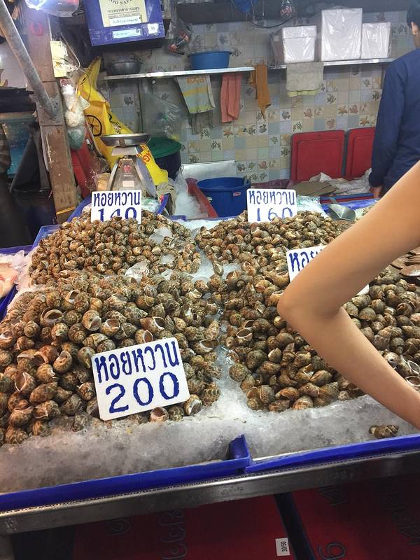 芭提雅海鲜市场在北部靠近城市公园和神殿寺,从市中心的second road做双条车到大路边,走来几分钟。海鲜主要是基围虾、螃蟹和绿壳海虹,许多都是活的,价钱实惠,海虹50TB(十几元)、基围虾300TB(七十元左右)一公斤。