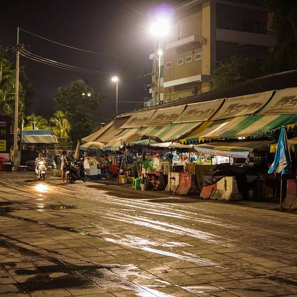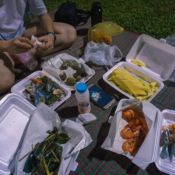 虽然爸妈特别叮嘱在 芭提雅 不可以在外面待到太晚,我们两个还是兴高采烈地坐上了北段的双条车,跑到了他们当地人的【海鲜市场】。明明两个人都不懂海鲜的价钱,不懂得怎么挑选好的海鲜,也不知道什么应该烤什么应该蒸,不过大概也是因为这样,在公园铺开地垫一边喝饮料一边吃的时候,才会觉得特别满足开心。 在谷歌地图上搜“ 芭提雅 海鲜市场”,坐上北段的双条车,就会来到这个不太大的市场。这边的海鲜都是居民们当天早上捞的,卖到晚上七点左右收摊,如果早一些来也许能吃到更新鲜的。市场里就有现场加工的摊子,也有卖一小包一小包的调味料。更棒的是!市场的旁边就是一个绿地公园,公园里更是有专门出租野餐垫的小店,只要20铢就可以和朋友们坐在一起,一边吹风一边吃新鲜的海鲜,这样的夜晚实在是太开心了!虽然我们不太懂价钱,可是买了虾、青口和一个贝类的不知道是啥,再加上60铢的加工费,最后也不过花了100人民币左右。而且这样现买现做出来的海鲜真的好吃!即使我们忘记买调料包了,味道有些淡,但是还是吃的出来它们的鲜甜。黄色的一大盒就是 泰国 的青芒。口感居然是脆的!让我们有点不习惯。芒果肉本身没什么甜味,但是在嘴里咬开时,就会散发出清爽的芒果香。它吃起来还蛮特别的!但我选软软的黄色芒果~