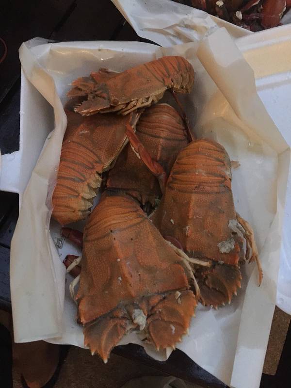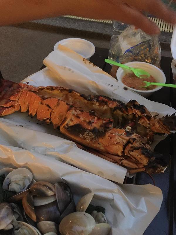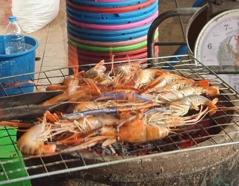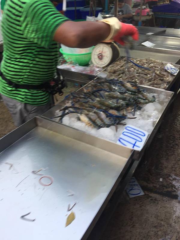 来到芭提雅,海鲜大餐是必须的呀! 中午时分,我带着他们去离住地不远的海鲜市场午餐。 海鲜市场不算特别大,有个小小的停车场,不过中午时分,来买海鲜和吃海鲜的人特别多,停得满满当当的。海鲜都是以公斤标价的,按海鲜个头的大小、鲜活程度,价格相差也比较大。 我喜欢这样的鲜活的市场,特别富有生气。 我和老爸挑花了眼,索性挑个头最大的买。买好了海鲜,旁边有两家可以烹饪的摊子,煎炒烹炸都可以,加工费30泰铢一个。还兼买炒饭、炒青菜什么的。很是方便。再花20株租一个毯子,席地而坐,丰盛的海鲜大餐就得了海鲜非常新鲜,个头大肉质紧实,口感鲜甜。 我尤其爱这个烤虾。