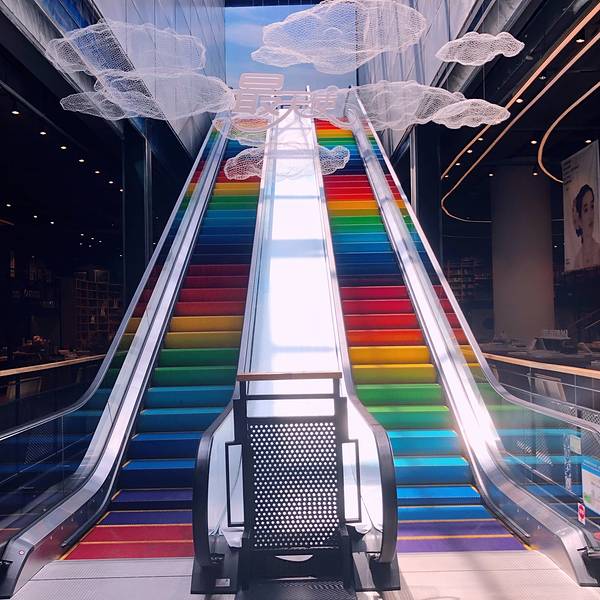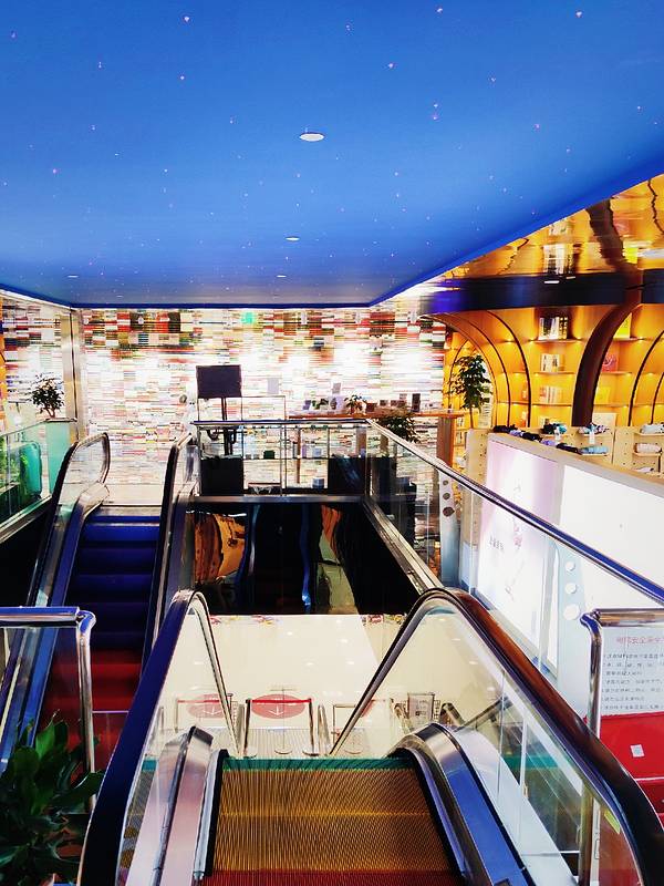 24小时不打烊的书吧,环境布置上很有文艺范儿。上下电梯均染成,彩虹色,还有电梯上方挂上了朵朵白云