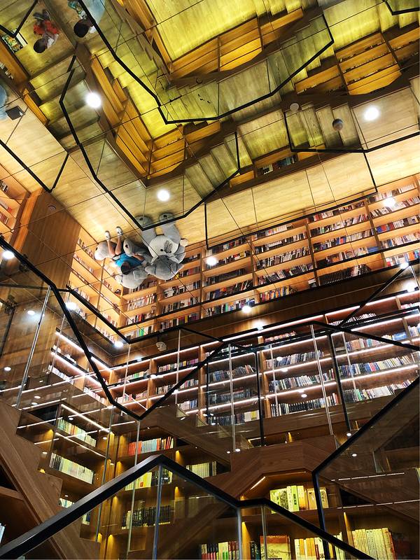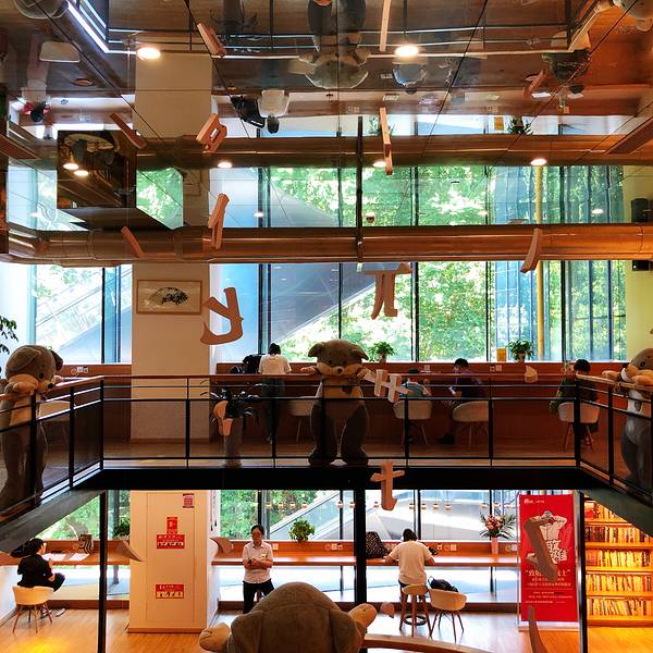 杭州排名很靠前的一家书店,看了评价都很不错,钟书阁、言又几、茑屋之类的在上海都有,对于喜欢逛书店的我来说,来到杭州的第一件事就是去这家书店。之前看评价都称之为网红书店,所以进门后给我的两个印象是漂亮和太小。不过,不去和大型书店作比较,只谈设计的话,的确可以说是漂亮,楼梯间的线条设计让人眼前一亮,天花板用了镜面,使得原本并不大的空间显得大了很多。这里的阅读者大多是孩子,到处都有大型玩偶装饰,让孩子们喜欢来这里。大略地看了下这里的书籍,儿童类的较多,还有就是女性类读物也不少,随便逛逛总能翻到自己感兴趣的书,一本安藤忠雄的传记我便能看上许久。炎热的夏日在漂亮的书店里坐上一下午也是不错的吧。