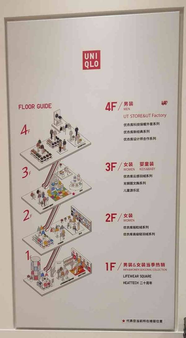 这家据说是国内最大的优衣库了,位于天河维多利亚广场,从一楼一直到四楼,算上负一层的子品牌一共五层楼,每层对外一圈展示着模特,看起来挺震撼。二三层女装,四层男装,一层是当季热销。店内有升降梯,但到负...