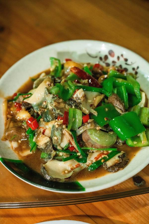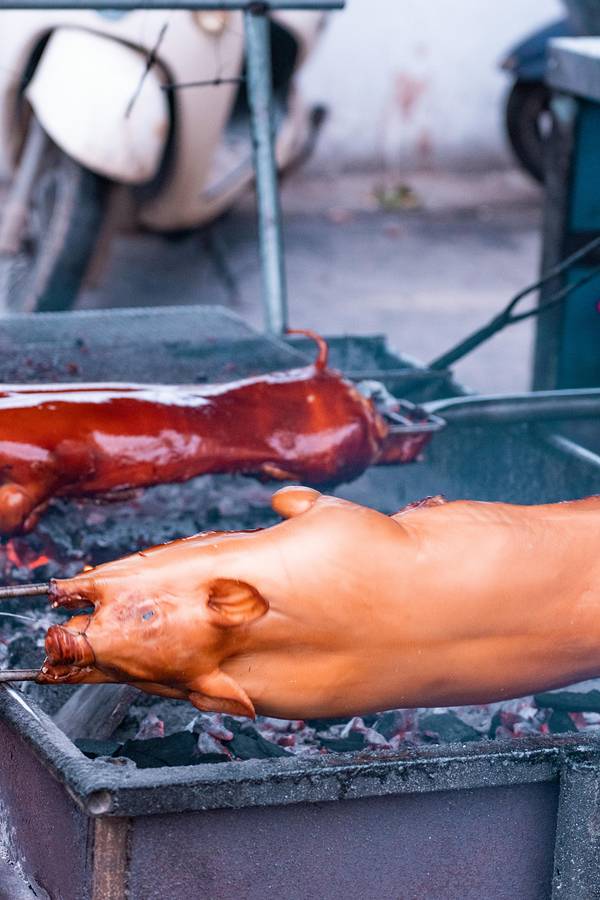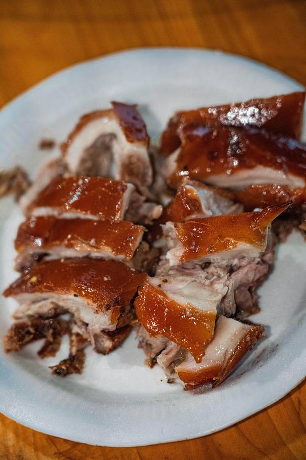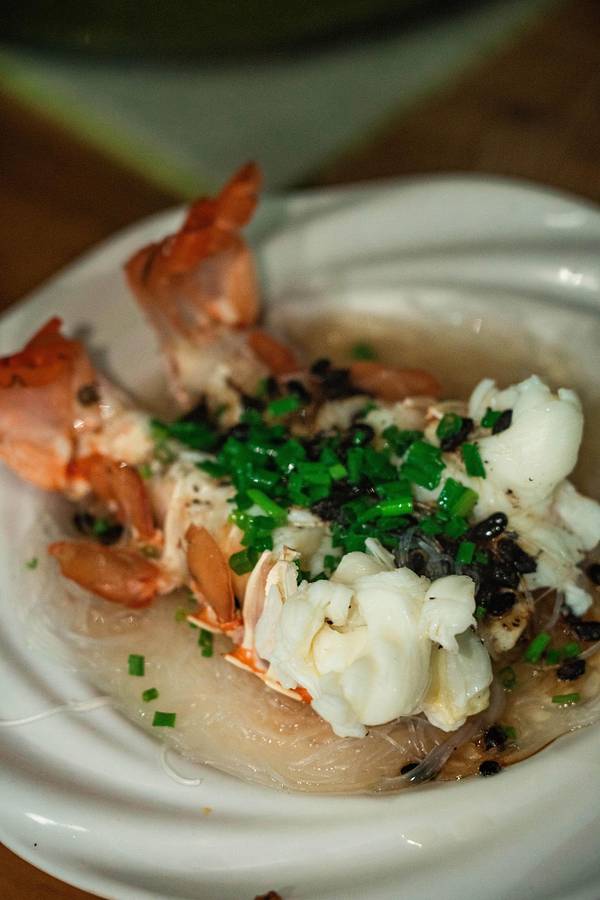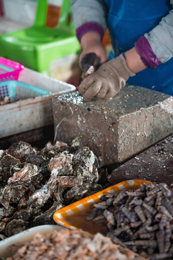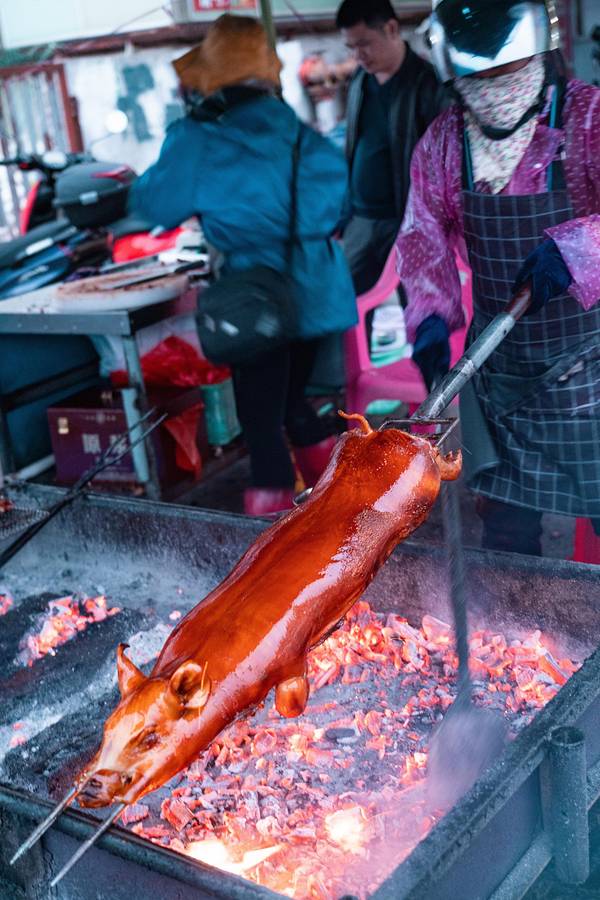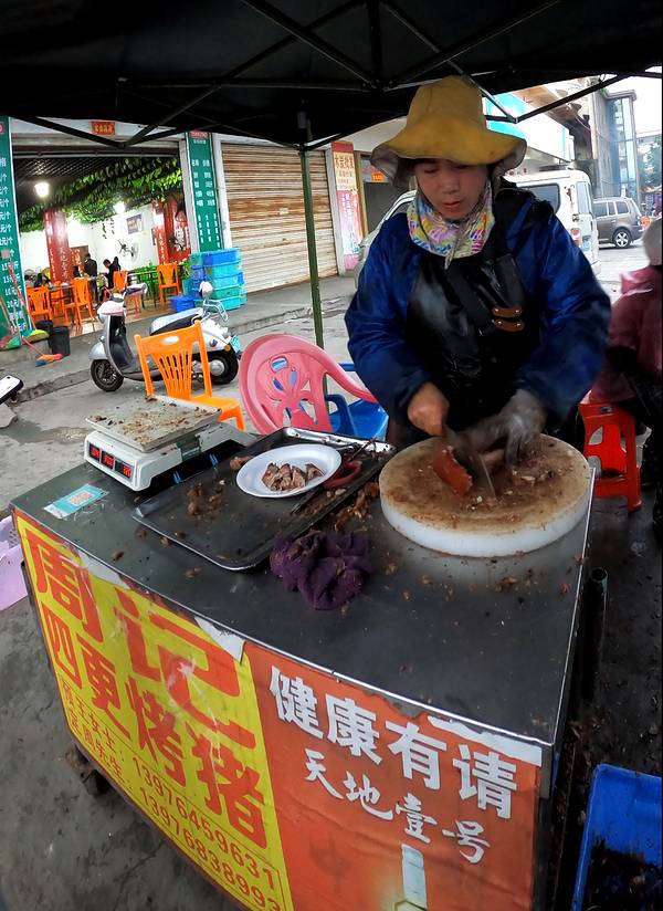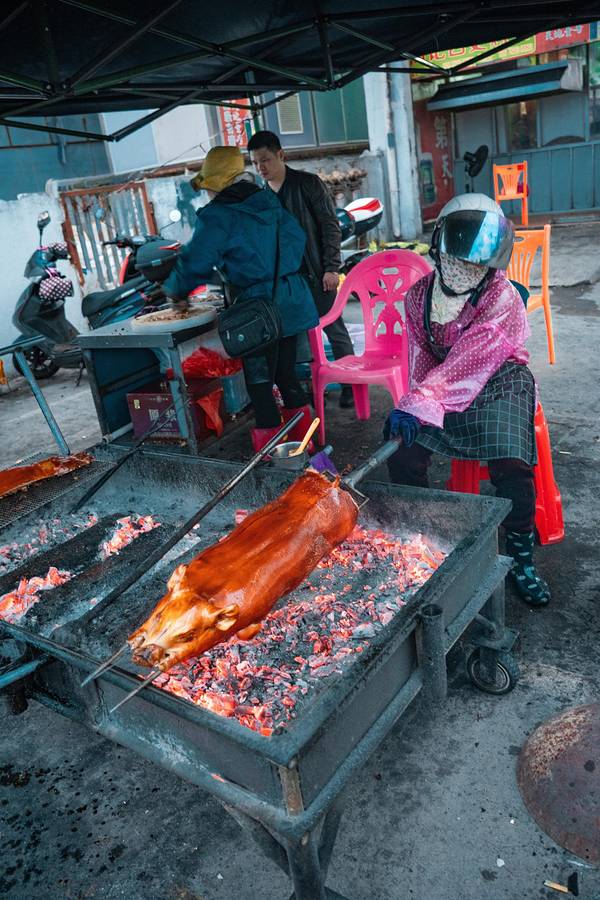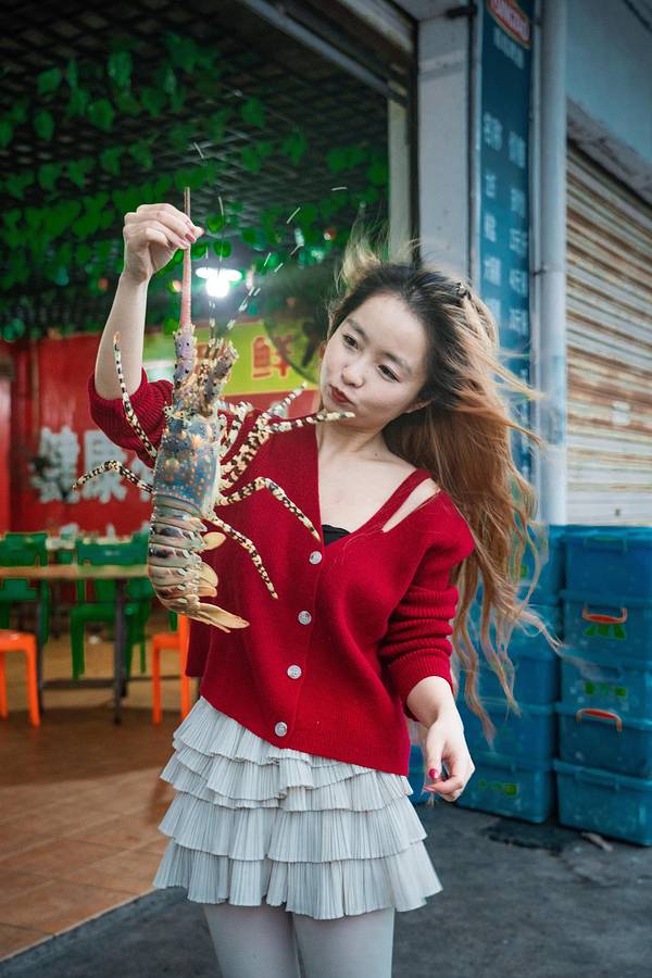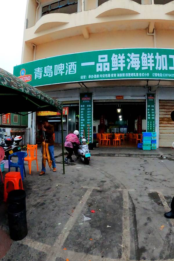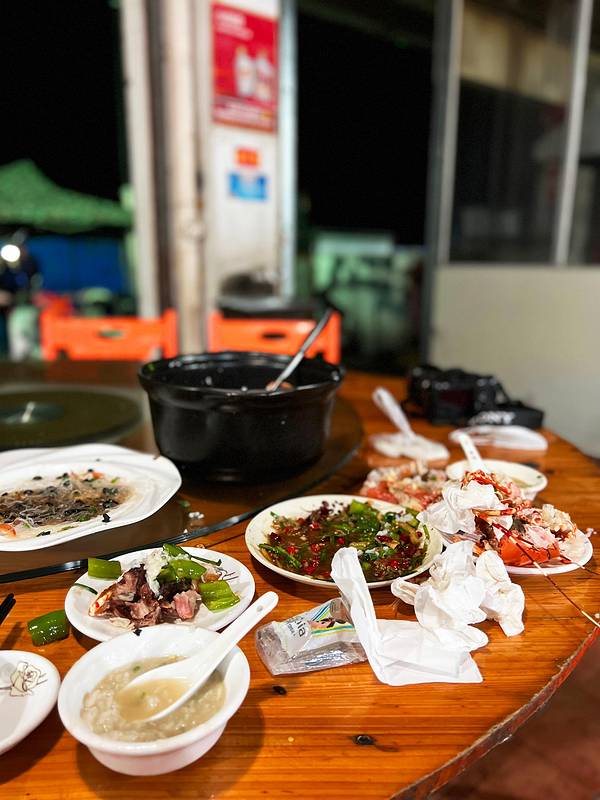 从酒店步行200米就是“八所渔港”,旁边是一个海鲜市场,品种挺多的,很多当地人也在这里采购。我们两本身胃口不大,琳琅满目的海鲜挑花了眼,最后看中了这个颜值比较高的大花龙,开价380/斤,我们还价到350/斤(我们不太会还价…应该还能更低的),还买了两个忘记了名字的螺。买完走的时候,有个当地人搭讪我们去他们家餐厅加工海鲜,一开始有点害怕会不会被宰啊之类,但想着小爸身上绑了一个GoPro一直在录视频,而且这家餐厅就在海鲜市场隔壁,是开放式的路边摊环境,店面挺大的,门口来往的人也挺多,就跟着进去了。(下图是视频里截的,当时全程没怎么拍照)两斤多的大花龙可以做两种吃法,虾头熬粥,虾肉做了豆豉蒸粉丝(我不吃蒜,所以没法做蒜蓉,换成了豆豉),螺肉做了微辣爆炒。 和即将下锅的龙虾君合张影吧!烤乳猪是东方市的名菜,做行程的时候我就已经被馋的不行了,想好一定要来吃一次! 海鲜市场门口有好几个卖烤乳猪的商贩,前面刚到的时候,闻到味道就已经香到不行了。因为一只猪会有很多人买,所以无论要猪的哪个部位,都必须搭配一点点猪头肉一起买。味道真的太绝了!外皮的酥脆口感和北京烤鸭类似,但个人觉得比烤鸭好吃,吃起来没有那么的油,不容易腻,蘸白糖的吃法听上去很黑暗,实际与有意想不到的口感,不知道是不是心理作用,甚至觉得蘸了点糖好像觉得还降低了油腻感?龙虾肉吃的巨满足,肉质很嫩很大块,新鲜到虾壳可以完整的从肉上剥下来。我们本身就都很喜欢吃海鲜粥,这一锅真的吃的超级满足!就是烧的时间不够长,还不是太入味。螺肉味道也不错,就是炒的太辣了,我们怀疑这位当地厨师是不是去四川进修过…结束!满足!———————— 买海鲜可以货比三家多逛逛问问价钱,当地人态度都挺好的。 海鲜市场里缓解比较杂乱,地上都是水,建议穿耐脏的裤子和鞋。周边的餐厅也是路边摊环境,对环境要求高者慎来。