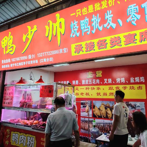 菜市里竟有如此好吃的烧鸭和卤水鸭头、鸭翅膀! 这两种美食确实很新鲜,都是当天杀的鸭子做的,很入味。关键是价格实惠,烧鸭16.8元一斤,卤水鸭头2元一个,鸭脚、翅1.5元一个,好便宜啊。不要以为便宜没好货,这家店可是连锁店,卖的菜品都是获大奖的,现在是新店开业,让利于民。 这家店就是南宁亭子菜市里的鸭少帅,我在这看到很多人来买,有个阿姨买了10几个鸭脚翅,说是太好吃了。
