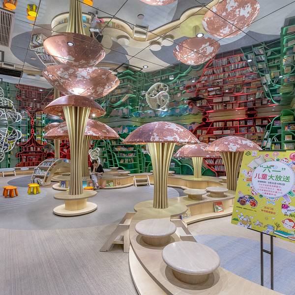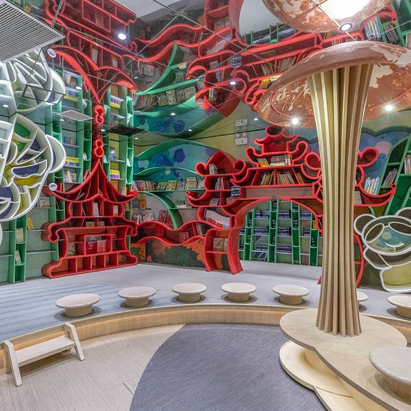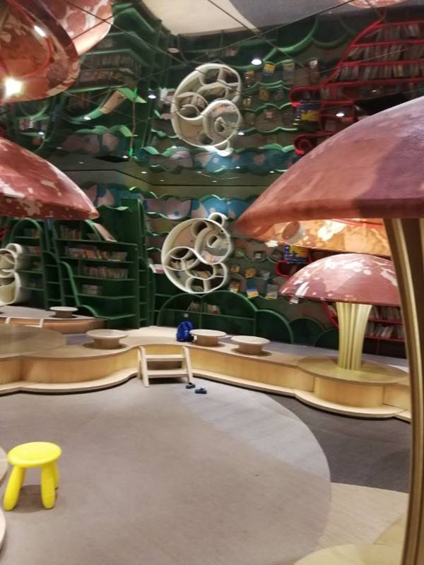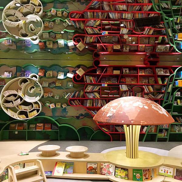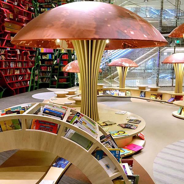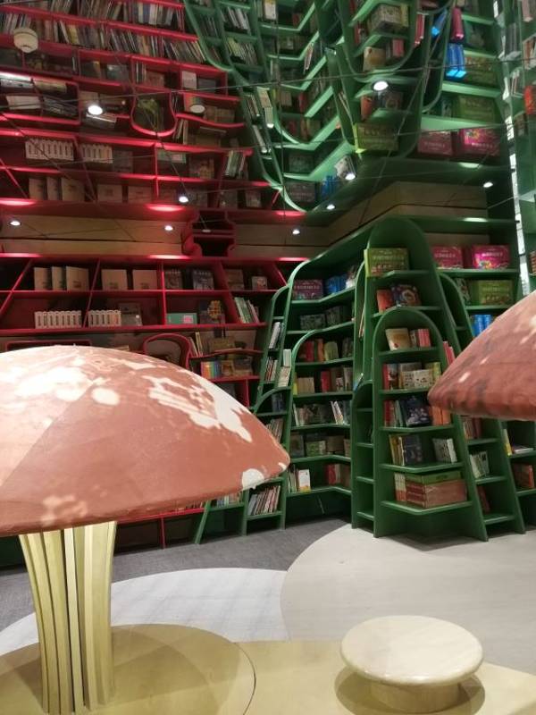 迄今为止所看到过的最美的书店~书籍是人类进步的阶梯~走廊尽头的演讲厅,设计师用镜面吊顶的手法把两侧书架的视觉效果拉伸到仰望的高度,在天花镜面的倒影下,仿佛穿越时光的对话。令人惊喜的是儿童区,借用彩色的设计,跳脱出了周围环境的束缚,让人宛如进到了童话中的梦幻世界一般。四周都是熊猫状的宝塔和书柜,从地板延伸而上的蘑菇造型的书架打造出了一个森林王国!