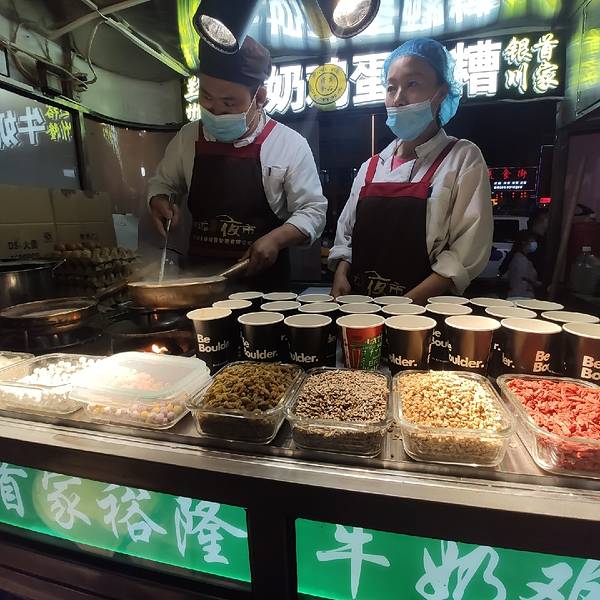 【感受】 是银川最有名的夜市啦,一下车就迫不及待吃起来,没有货比三家转一转,后面下大雨时就发现这是个多么正确的决定哈哈哈 ◇【辣条】都说蒜香的好吃,也就那样吧,我都咬不动 ◇【牛奶醪糟】烫得要命,暴雨时候全靠它取暖来着🤣,挺好喝的,是我的菜 ◇【宫廷牛肉酥饼】其实吃着和北京家门口超市发4块钱一个的没啥区别。。就是现场做和暴雨中也有老多人排队比较壮观吧 ◇★★★★★【甜醅子奶茶】绝对是我的菜,谁家做的我都爱喝,一路从银川喝到了甘肃,还在天天喝哈哈哈,分量真大啊700ML巨大一杯,灰常满足★★★★★ 【超大爆米花】17块一大兜子,我这样的爆米花星人肿么可能错过,暴雨中房檐下躲雨佳品,基本都造完了🤣 下大雨前紧赶慢赶吃了这些,其实各地夜市都差不太多,同质化蛮严重的,主要是感受下当地城市的氛围;走过兰州\敦煌\西宁\西安的夜市回头看,怀远夜市是规模最大最合口味的那个呢,当时不懂得珍视,没有比较就没有伤害15551
