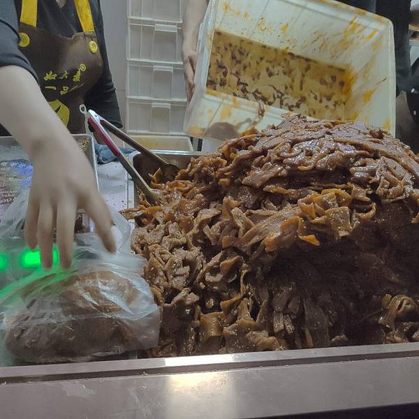 其中有两个网红小吃排队的人特别多,建议早上去买,一个就是怀远一品辣条,辣条可以真空包装带走,10元1包,另外一个就是上过天天向上的宫廷酥牛肉饼,3.5元一个,味道真的不错。