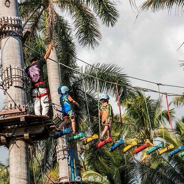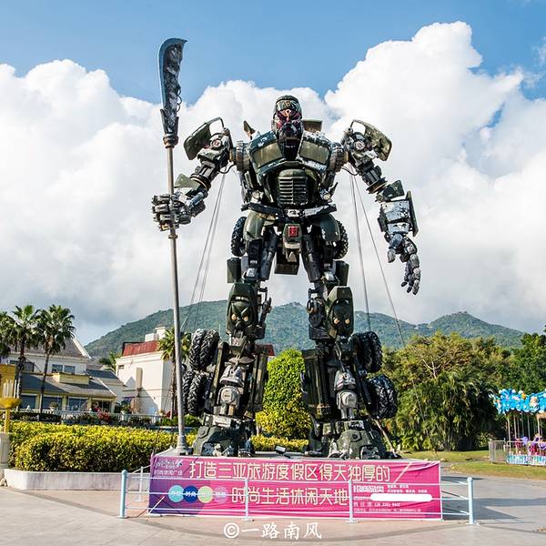 亚龙湾有一个商业区,所有建筑物都是欧式洋房,黄、红两个色调非常养眼。百花谷位于亚龙湾度假中心的核心地带,由于周边高端酒店林立,这里也属于中高端消费区。各种类型的餐厅是百花谷的主角,其中包括粤菜、海南菜、川菜、北方菜、西餐、自助餐等。一般情况下,游客白天到景区游玩,或者泡在酒店游泳、享受休闲设施,因此百花谷在下午五点钟之前都不算热闹,黄昏开始才是人气最好的时候。百花谷除了适合消费、购物,还有很多好玩的地方,比如供儿童玩乐的小小游乐场,而位于广场入口处的变形金刚则是最吸引游客的地标,很多人经过这里都会掏出相机或手机拍下特别的一幕。最特别的是这个变形金刚居然是按照中国历史传奇人物-关云长(关公)的人物形象设计的,非常有创意。棕榈树和椰子树是百花谷外广场的主角,它们和周边的绿草地、欧式建筑构成一幅美丽画图。百花谷靠近公路的地方有一片小小的“丛林穿越”体验区,所谓的丛林穿越,其实就是将悬索桥安装在树干之间让年轻游客穿越体验,考验及锻炼自己的胆量,期间由专业的教练带队。