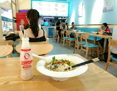 鱼拿酸菜鱼分店就在广场附近,原价25元酸菜鱼粉或面套餐(饮料三选一,选了豆奶),居然把酸菜、娃娃菜、炸黄豆等配菜都分开列价,难怪原价虚高,团购特价20元,俺抢到秒杀10元。