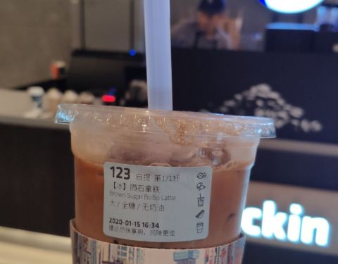隔了一段时间,今天刚好休假就来喝瑞幸咖啡了。 还是来的百方广场,虽然现在离家最近的应该是海垦店,只不过习惯了这里。 今天点的是陨石拿铁,这个看了好久了,今天第一次喝。 只能选冷饮,全糖。可以自行选择+3元加奶油,我没加。 拿到咖啡喝了一口,感觉应该就是黑糖拿铁的基础上加了寒天。味道挺不错的。