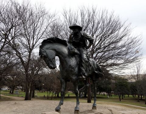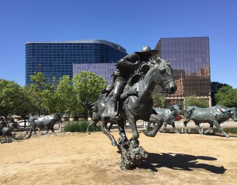 这个广场其实是在市区里面,但是确实还挺有那种以前那种的风格的,主要是它有很多反应牛仔或者是美国西部的那些特色的雕塑吧。还可以。