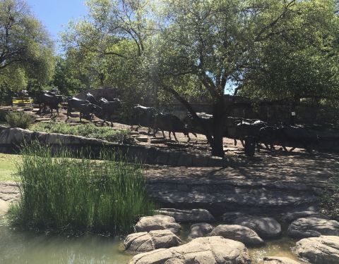 广场挺小的,一组雕像完全占据了广场几乎所有的位置,雕像反映的是一群被牛仔驱赶着过河的牛,非常的生动和形象,甚至那条河也被人工修建出来。