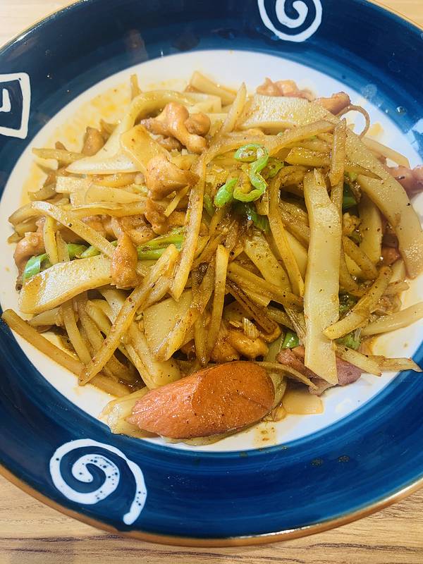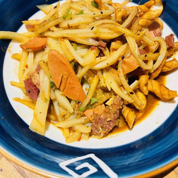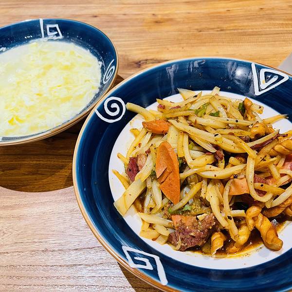 不得不说董记炒碗托家的装修风格还是很吸引人的。首先这家的房子是一个古建筑,外面的门一看就很有历史感,所以前面碗托店的装修风格是按照古时候的风格装修, 一进门就被黄色的灯笼所吸引,从商家那里了解到灯笼全都是手工编织,上面全是店里面的菜名,看着就非常的有意境,现在有很多餐馆都是不挂灯笼的,就算是挂着,也没有多少人可以了解其中的含义,在过去,厨师行当里有一个规矩,灯笼不能够随便乱挂,它的作用比饭店的招牌还要大。黄色灯笼寓意着富贵和吉祥。桌椅也都是木质的,在这样舒适的氛围里不得不先点一份肥肠肘花炒碗托再配点凉菜,再来一碗醪糟汤,简直就是一种享受。他家主打的就是炒碗托,有肥肠肘花炒碗托、牛肉烤肠炒碗托,如果这两种碗托都不够吃,还可以自己加配料(烤肠、牛肉、午餐肉、小炒肉、麻花、肥肠、火腿、肘花、熏肉、饼子)自己喜欢吃什么就加什么,不管加什么,都不会踩雷。