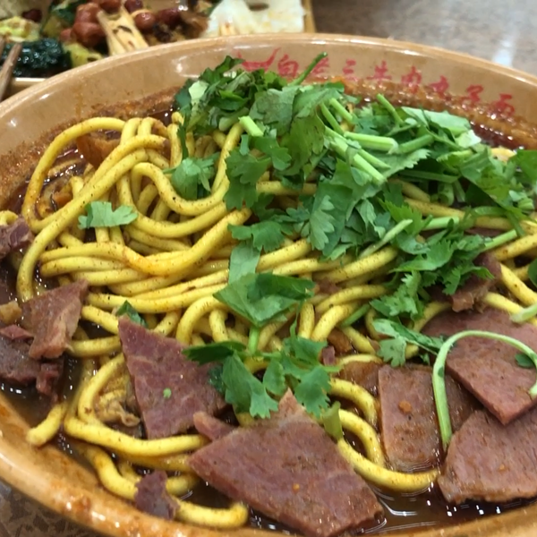 没有传说的那么好吃,也可能是我不太习惯这个味道,感觉一般。 餐厅面积不大,客人倒是不少,还有光膀子吃饭的,环境差了一些。虽然是清真小餐厅,却可以预定牛头宴,不过,要提前一个星期预定才行。 要是吃面...