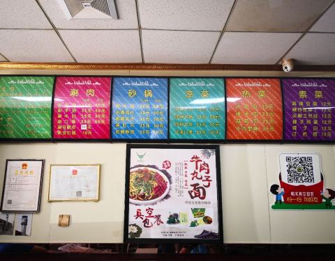 没有传说的那么好吃,也可能是我不太习惯这个味道,感觉一般。 餐厅面积不大,客人倒是不少,还有光膀子吃饭的,环境差了一些。虽然是清真小餐厅,却可以预定牛头宴,不过,要提前一个星期预定才行。 要是吃面的话可以坐小饭桌,这个挺有意思,也没有餐巾纸,手纸擦嘴的感觉不太好。餐厅里面不少美女也在这里吃上一碗牛肉丸子面,算是这里一道风景吧。 牛肉丸子面没啥可多说的,量大实惠,填饱肚子即可。一碗丸子面里辣椒面不少,好在吃进嘴里不算太辣。 门口就是商业街,比较热闹,停车没戏,还是走过去吧。 门脸不大,感觉脏乎乎的,可能是不少人喜欢这里,客人不少。