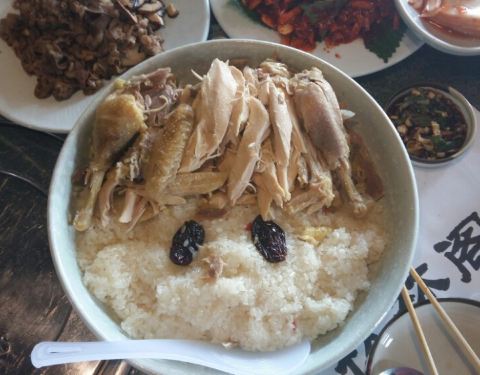 旅游来到这个城市,朋友说这家餐厅很出名,就带我们过来尝尝了,坐着出租车过来,附近好像挺偏僻的,到处黑黑的,离市中心应该有一段距离吧。这里是庭园式的建筑,有两层楼高,一楼是大厅,二楼是厅房,这里的房间挺大的。进去厅房需要脱鞋子,里面的桌子很矮,脚要不盘起来坐,要不伸直塞到桌子底下,我们当然就不习惯这一种坐法,吃着吃着,脚就麻了。 吃朝鲜菜,人参鸡饭一定要点,一整只的鸡,下面是糯米,还放了苟杞子等一些原料,吃起来饭粘粘的,甜甜的,人参的味道、原只鸡的味道,吸进了糯米饭里面,使到饭很甘香。米肠应该也是招牌菜,一碟很大份,一块块圆圆的肠子,外面一层好像是皮一样,中间的也是糯米做的,吃起来外面脆皮,里面黏黏的,也是很甘香。有机豆腐也很特别,端上来的时候,看上去不太起眼,就是一块豆腐,一块大大的豆腐,表面看上去邹邹的,黄黄的,谁知道吃起来里面很滑,很有豆香味,说是有机的豆腐,没有添加什么加工的成分。 这里的服务很不错,一进大门,就有穿着朝鲜服装的服务员迎了上来,服务员们都是那么的毕恭毕敬,我对这些朝鲜服装很感兴趣,看到女生们都会把双手塞进衣服里面,不知道是不是有什么特别含意呢?餐厅的环境很好,是中央电视台一个电视剧的拍摄地。