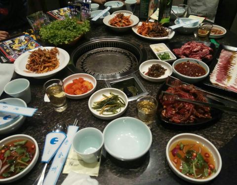 ...一大桌子菜,烤了好多吃的,真心很好吃,尤其是小咸菜味道绝了,烤肉的肉质也非常肥嫩,特色是牛肋条