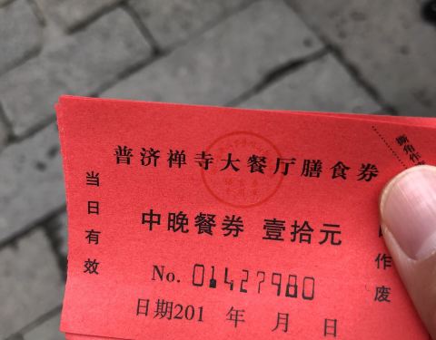 普陀山普济寺内的素斋,价格便宜,十元一位,进门后一人拿两个碗筷子,一菜一饭,可以添饭,寓意“添福添寿”,切忌不可浪费。餐厅有空调 ,环境较为舒适。