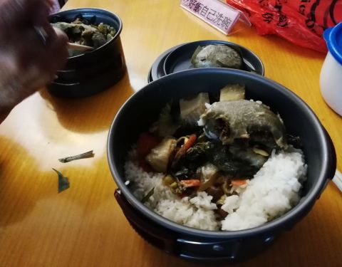 - 大家自己找位子坐. 進去之後拿兩個碗跟一雙筷子,一個碗裝米飯,一個碗裝菜. 吃完之後拿到後面自己清洗