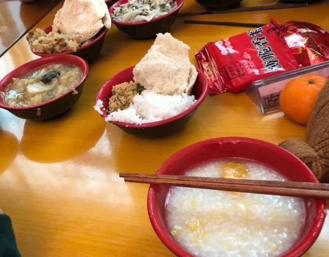 需要提前去排队,饭票便宜,粥很好喝,其它不太合口味,还有水果等