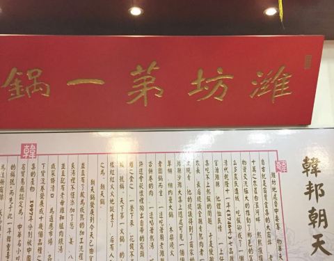 韩邦朝天锅是潍坊的知名朝天锅品牌,也是潍坊乃至全国第一家注册商标的朝天锅酒店 。韩邦朝天锅是一家以朝天锅为主打、融合了特色潍县菜的菜馆,也有多个可容纳十余人的包间,既可接待一人食,也能接待大型商务宴请,还单独辟出一个房间来打造正宗老潍县“朝天锅宴”,很好吃。