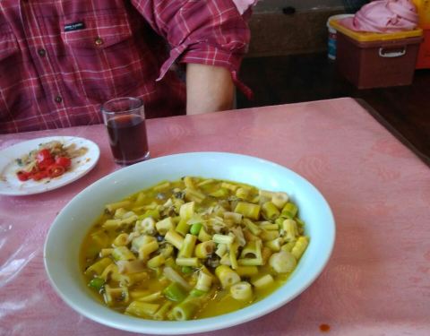 【红烧羊肉】118元/例,知道湖州练市的羊肉很有名,虽不知其的羊肉是否是练市的,但我们还是点了份“红烧羊肉”。其色泽红亮味道溢香,羊肉则是酥而不烂,不腻不膻蛮喜欢滴,就是略微辣了一点。 【印度葱油飞饼】20元/客,点“印度葱油飞饼”是因为进餐馆时就看到一位印度人在餐馆门口做飞饼,于是就有了尝尝印度人做的印度飞饼。“印度葱油飞饼”葱香可口,香酥浓郁蛮好吃滴。