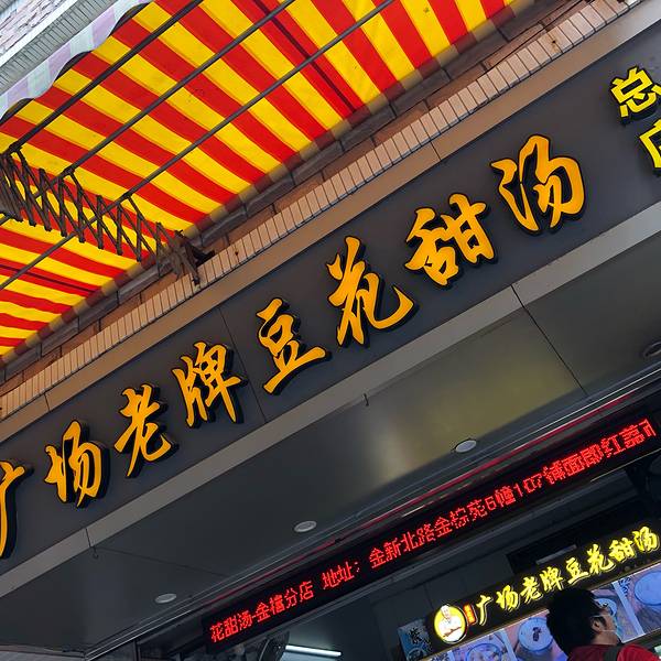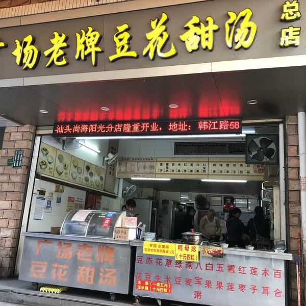 从中山路步行到广场老牌豆花甜汤,远远的就看见人潮排队买豆花。这里的豆花是卖完即止,要买就趁早了。 小小的店铺,里面只有几张桌椅,门口摆放着一排潮式糖水和潮式豆花。买糖水的不用排队,直接在旁...从中山路步行到广场老牌豆花甜汤,远远的就看见人潮排队买豆花。这里的豆花是卖完即止,要买就趁早了。 小小的店铺,里面只有几张桌椅,门口摆放着一排潮式糖水和潮式豆花。买糖水的不用排队,直接在旁边买就可以了。如果要买豆花请另外排队。很多人都是买了糖水一边吃一边排队买豆花。 在排队的时候偶遇上海的吃货们,这是他们买的糖水,我们没吃。据说糖水太甜,不符合他们的口味。 排了约20分钟终于买到一碗豆花了,豆花 4元一碗。如果是在店铺里吃的豆花,店家是铺一层豆花,洒一层糖,然后再铺一层豆花,总共铺4层,让豆花和糖粉融合在一起。如果是外卖打包的就把豆花放在打包盒里,糖粉另外放在小袋子里,吃的时候再洒上去搅拌均匀。 这里的豆花与我们平时吃的豆花有所不同,我们平常的豆花都是水嫩水嫩,白白滑滑的。这里的豆花看上去就很浓稠很结实,感觉像“老痰”,老豆腐。口味可以选择加红糖或者白糖,加上糖粉混合在一起吃,豆香浓郁,有一点点Q糯感,粗犷中又带有一些细滑。味道还不错的,值得一试。