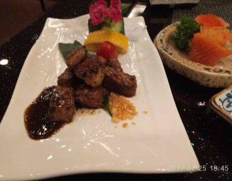 这家店无论外观还是进门感受比较陈旧,身处桂山大酒店内,算是旁边一座楼,由于五点半才开餐,我们五点到达他们还在休息阶段接待有些懒散的感觉,但是五点半开始点餐时间总体服务还是跟上了。 日料在于选材和调味两个大的方面,刺身的三文鱼品质不敢说是一流,相对还可以,北极贝的规格比较大个,用的手磨山葵。煎芦笋和三文鱼寿司没任何不足,表扬香煎牛肉,好像是澳洲系列的仅次于和牛那一类,份量不小才卖218一份,还有个泡菜锅口味很适合我们吃酸辣的。 这家店除了装修老旧外,人均在300左右还是很好的了。