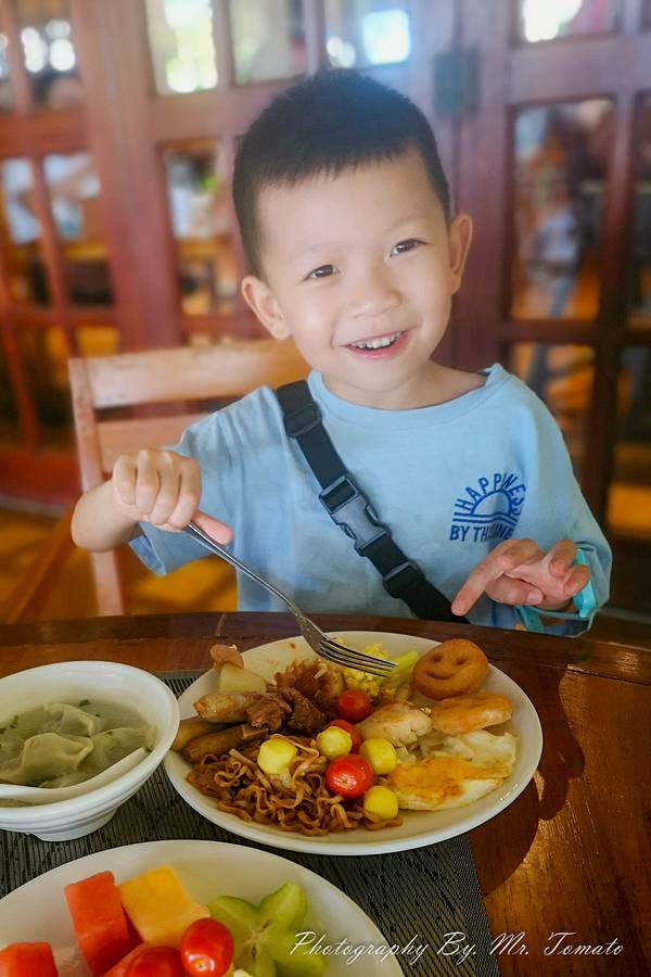 酒店有三个餐厅提供自助早餐,其中最大的风格最棒的是花屿海,位于酒店的正中心,装修很有南洋风情。东西也比较全,一大早的就有白灼虾,不过来自海边的我们表示,一大早吃虾实在吃不下。桃大王拿了个小杯子自己去“挤牛奶”喝。