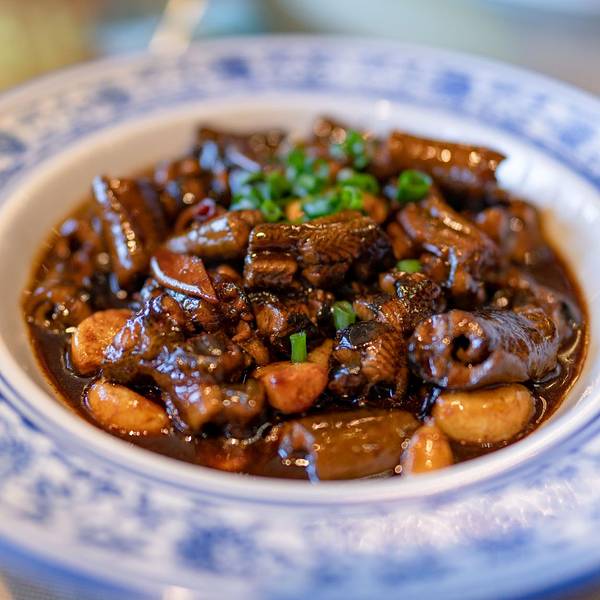 到周庄,一定要去的便是沈厅酒家,到沈厅酒店一定要吃的便是沈厅酒家的万三家宴八大碗,万三家宴八大碗一定要吃的便是万三蹄。 说起万三蹄,他还有一个典故,其实万三蹄就是我们俗说的猪蹄,或者猪肘子,那他为什么不叫猪蹄或者猪肘子呢,事情是这样的。 在朱元璋时期,朱元璋到沈万三家做客,沈万三以猪蹄膀招待朱元璋,因皇帝在上不能动刀,所以沈万三从蹄膀中抽出一根细的骨头来,以骨切肉,也就有了现在,用骨头切肉这一吃法。 朱元璋吃了觉得很好吃,就问沈万三这道菜叫什么名字,因“朱”与“猪”同音,所以沈万三为其取名为万三蹄,这也就是万三蹄名字和吃法的由来, 万三蹄是团圆的象征,逢年过节家里来客人了,一定会有这道菜,所谓“无蹄不成宴”“肥而不腻,酥而不烂”,它的做工相当考究,要经过几个小时的焖蒸煨煮,加上十几味原料,才形成了蹄色酱红,香气扑鼻,外形饱满的特点,味道超赞。三味圆,这个看似像鱼丸的丸子,其实是用面筋做成的,三味圆放在鸡汤内煮熟,皮薄馅嫩,味道鲜美。这飘香炸金砖究竟是一道什么菜呢?竟然是一盘炸豆腐,把豆腐干炸的酥脆金黄然后配上特制酱料,就因为这金黄的颜色,刚出锅超像金砖,所以取名叫飘香炸金砖红烧鳝筒,将新鲜的鳝鱼活宰后先洗净切段状,然后红烧后即可。田螺塞肉,平时很少吃螺类,今天终于没忍住,这道菜是要把田螺肉挖出来,然后加入猪腿肉剁碎剁细,再加上葱、姜、料酒等调料,最后再将其塞入田螺壳内进行烹饪。可谓餐两味,既有田螺的鲜又有猪肉的香,味美可口!这红烧桂鱼的做法就是红烧,鱼头鱼尾做得翘起呈元宝状,其寓意是招财进宝,而且味道超赞,酸甜适口,肉质鲜嫩。油卜塞肉,这是周庄的家常菜,将猪肉之精腿肉加调料剁细后与野菜一起塞入豆制品油卜中再烹饪。周庄人有一种创新精神,他们能把猪肉剁碎后塞到任何可能做成食物的东西里,于是又形成一道新菜。农家鳗鲤菜又叫周庄阿婆菜,别看这道简单的家常菜,却要精工数月的流程才可制成,采摘油菜的嫩苔用清水洗净,放在阳光下晒成半干,然后以小甏(bèng)腌制,甏口用箬(ruò)叶和黄泥密封,倒置在陶盆内,防止漏气,这些菜色中虽有一些已经很普通,进入了我们的家常菜系列。不过当加入了历史、文化元素后,它就变得不再普通,它不仅仅是一种食物,更是一种文化的传承。