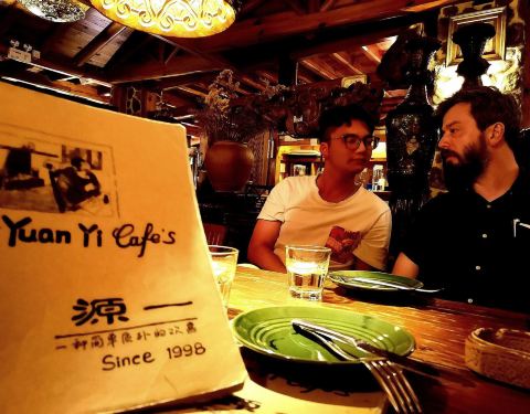 曲靖的源一咖啡馆,是当地朋友介绍我们去的。原本想去喝咖啡聊天,不知不觉中,却连晚饭也解决了。除了咖啡和蛋糕之类,他们的红烧牛肉烩饭和蛋包饭,以及生炸鱿鱼,也都味道不错,水果披萨也蛮好吃。