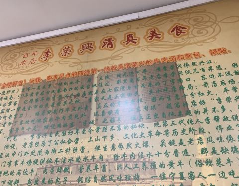 李荣兴是南京本地老牌的餐馆,也是七家湾牛肉锅贴的传承处,距今已有百年的历史了。这家人气挺高的,里面经常要排队,上菜的速度一般般,服务也一般般,卫生不是特别好。他们家主打清真口味,以牛肉面、牛肉锅贴...李荣兴是南京本地老牌的餐馆,也是七家湾牛肉锅贴的传承处,距今已有百年的历史了。这家人气挺高的,里面经常要排队,上菜的速度一般般,服务也一般般,卫生不是特别好。他们家主打清真口味,以牛肉面、牛肉锅贴、牛肉煎包、韭菜锅饺、牛肉馄饨等为主,这些也是南京的金牌小吃。他们家的牛肉汤特别棒,一大锅的牛肉汤要熬制三四个小时,都是一次性熬制,味道比老母鸡汤都要香。牛杂汤汤料充足,味道醇厚。牛肉锅贴是必点的,酥脆香甜,嫩滑多汁。他们家的牛肉汤包更棒,皮子和馅儿都比李记清真馆要好。李荣兴以前是在七家湾区域,后来因为拆迁搬到了南湖凤凰二村小区这边,南湖也是南京美食的聚集地。这里位置还是比较好找的,交通也比较方便。