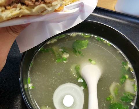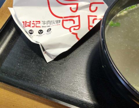 - 火烧是酥皮的,牛肉也是热的,超好吃。不过牛肉汤就不大有味道了,全部是清汤,什么味儿都没有