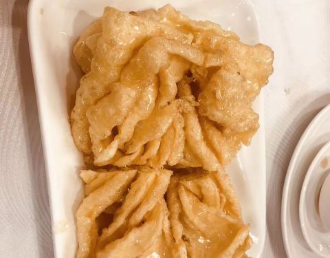 番禺宾馆~冰糖蛋散,菊花卖。非常可圈可点的美味,八点左右我们才吃了银记并吃反胃的情况下接着十点半又要吃饭,这是蛮挑战的,但觉得每件点心都非常好吃,可见是多棒,招牌的鱼卖我个人觉得有点淡,配酱油又抢...