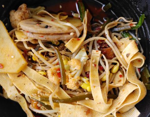 炝锅里面加上魔芋,加上腐竹,还有菜花,豆皮儿,土豆片等等也都很好吃。【口味】炝锅的量还是比较大的