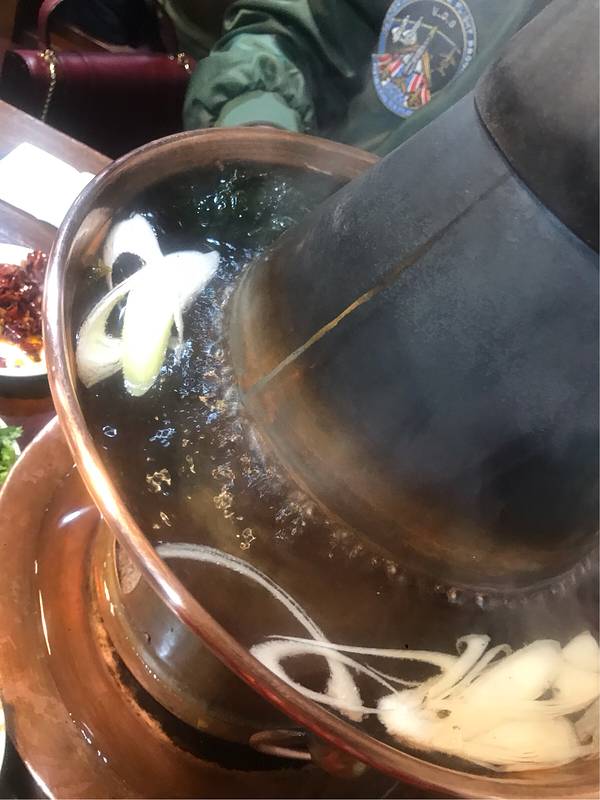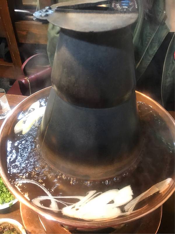 是用传统的铜火锅,是烧碳的,和用电磁炉涮羊肉的感觉就不一样。
