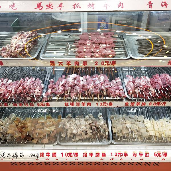稍作休息之后,我们便下楼寻找美食了。而在莫家街,一定要帮衬的就是马忠食府了。马忠的招牌很大,路过必定看到,里面以羊肉为主,你能想到的羊身上的各个部位,在这里都能找得到,价格丰俭由人,羊肉串从几块到几十块一串都有,5块钱一碗的羊奶酸奶看着就心动,羊杂汤适合不吃辣的朋友,除了羊肉,还有还多全国各地的美食,总之来这里肯定有适合你吃的东西。我们有很多都很想吃,由于肚子容量有限,只好先点了几样最想吃的。但我们在西宁前后停留了三天两夜,马忠便成为了我们的饭堂,每天必签到。羊奶做的酸奶,看着就想吃,5块一碗。羊肉串品种很多,丰俭由人。这里有蹄筋,手抓羊肉,羊排,按斤计算,拿多少算多少。点了一份羊肠和牛肚,羊肠很饱满,儿子不吃辣,我一个人吃有点腻。羊杂汤分量也很足,小朋友也喜欢。还有广东糖水,做得很有广味。