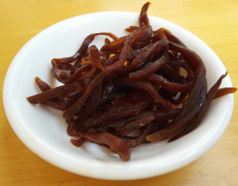 开在798里面的一家面馆,外观清清爽爽的,于是便走进来吃碗面。店里面十来张桌子,不大,比较挤。刚坐下便递上来一瓶芬达,一张菜单,还以为吃面都送饮料,后来才知道是搞错了,服务员刚要拿走,老板娘特豪爽地制止了,说送一瓶有啥关系哪有上了还撤走的,赞。点了酸菜肉丝面,面是拉面,比较筋道,面上只看到肉丝,没看到酸菜,尝了口汤,确实是酸菜味道。面翻起来才发现下面盖了一坨酸菜,好像酸菜和肉丝不是一起炒的,和南方的咸菜肉丝不同,口味却接近。随面还送一小碟酱菜。店里的冷盘可以点半份,于是来了半份芥末木耳,很爽口,木耳肥厚而且脆,挺好吃。