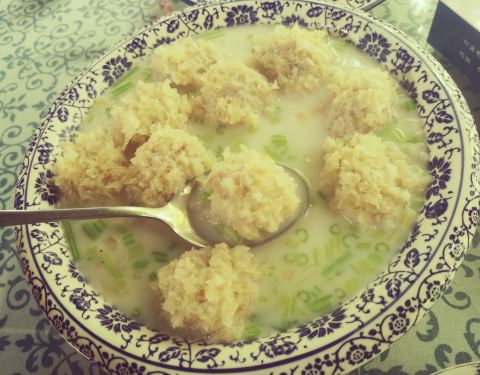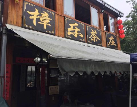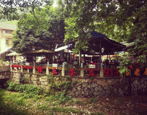 樟乐茶庄,梅家坞91号,梅家坞公交车站下车,但见一片青瓷茶庄,坐落于梅家坞的青山如画,绿意盎然之中,沿着小桥缓缓步入其中,邻溪露台而坐。谈笑间听溪水孱孱,赏山花烂漫,闻鸟叫蝉鸣,大自然赐予梅家坞的是一曲神奇又灵犀的篇章,一首动人却唱不完的歌曲。在依山傍水的樟乐茶庄,品味农家菜,喝喝龙井茶,人生所追求之惬意,也莫过于此。 [服务]老板很是热情,入座后邀请我们关注,立马送了两罐冰可乐解暑,这里扫码点单是扫码后,手工里出现菜单,再让服务员人工点单的。服务态度赞,动作效率高,有求则必应,服务员耐心向邻座客人介绍餐品,农家乐的热情又亲切的款待,仿佛去邻家做客,放松疲惫,心旷神怡。 |莼菜汤^杭州特色的莼菜汤,细滑的莼菜在唇齿间尖缠绵。在炎炎夏日里越发清爽开胃,汤底里放了醋,口味似乎更为浓稠,也记忆深刻。 |龙井宴球^匠心独具,造型精美,外层似乎是银耳,包裹着颗颗鱼肉虾肉组成的肉圆儿。宴球Q弹细腻顺滑,汤底漂浮着芹菜粒儿,鲜嫩之余,意犹未尽。龙井的秀美风情,尽在这一碗龙井宴球。 |酱爆螺蛳^朋友点的酱爆螺狮,酱香浓郁,超级下饭。本身不爱吃螺狮的我,竟然被“酱”惊艳无比,甚至用|龙井宴球^蘸了螺狮酱,也津津有味。 青花瓷的装饰格调,无处不在地点缀着,樟乐茶庄小桥流水般的意境,似乎更显宁静致远,眉眼之间全是你,梅家坞的新鲜空气。沁人心脾,畅快呼吸。 樟乐茶庄,依山傍水,惬意人生。