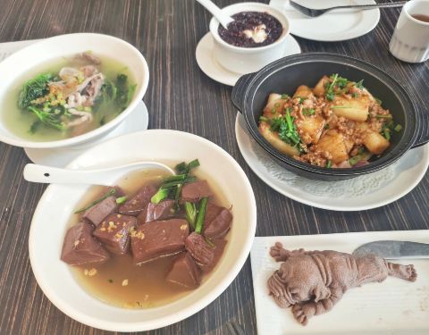 新海利的潮汕式早茶: 珠海有很多的潮汕人在这里生活居住,当然也就有很多的潮汕餐厅,新海利就是潮汕老板开的,这里早上到中午有提供早茶,晚市有提供海鲜;这天刚好来这里喝早茶,竟然有很可爱的茶点SET,好几款热门点心各一件,上下两层,还有蛋挞和酥类的,这个很受小朋友的欢迎;我们点了几样:蒸凤爪非常好吃、芋头糕很香而且分量十足、韭菜猪红里面猪红很好吃但是韭菜有点老、XO酱炒肠粉很赞、红豆双皮奶是热的但是双皮奶做得很滑;最好吃的是潮汕的上汤麻叶,这是潮汕特色,非常好吃,汤也很好喝,非常推荐;另外还有一个特别可爱的巧克力口味的奶冻,竟然是做成哈巴狗的样子,还配上刀,很多客人都会点这一道,真的做得很形象生动。 这里的口味是不错的,一直都有很多熟客,生意也很好,就餐环境很大舒服,很多家庭带着小孩老人来这里聚餐,价格很实惠,工作日还有折扣,像我这样点大概六到七样菜人均不到六十,所以很划算性价比很高的一家早茶店。 位置就在拱北华侨宾馆巴士站旁边,很多公交车都直接到。