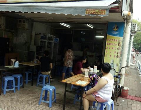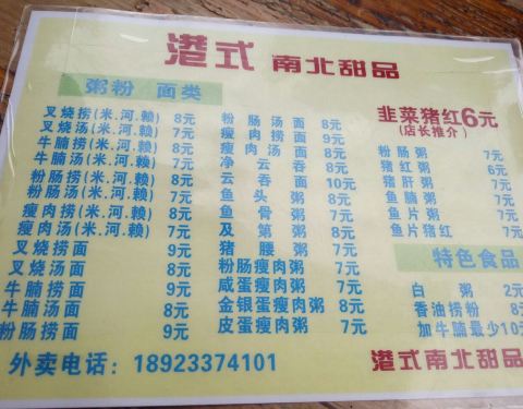 环境不怎么样的一家小店,有主食有甜品,都吃了。 我第一次经过是冲着芝麻糊去的,甜品里面红豆沙、双皮奶和芝麻糊我是不能割舍的。 很有香港和澳门街边小店的感觉,一样的广东话,很亲切熟悉。 云吞面才10元,牛腩面好像8元,芝麻糊5元一大碗,红豆沙也是,赞的不得了。