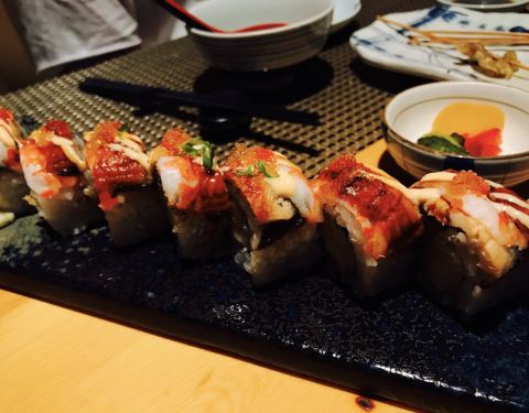 这是一家专做日式料理的餐厅,木质的屏风,榻榻米式的座位。一楼是散座及卡座,二楼都是包厢。餐厅出品的菜肴也饱受好评,摩托罗拉卷里面塞满了炸虾和蔬菜,外面裹以鱼片和鱼籽,内容丰富,调味正好。三文鱼刺身数量上不是特别多,但每片都切得蛮厚,口感相当饱满丰腴,新鲜度很高。