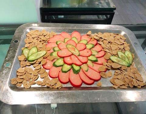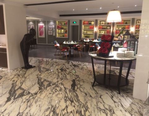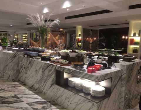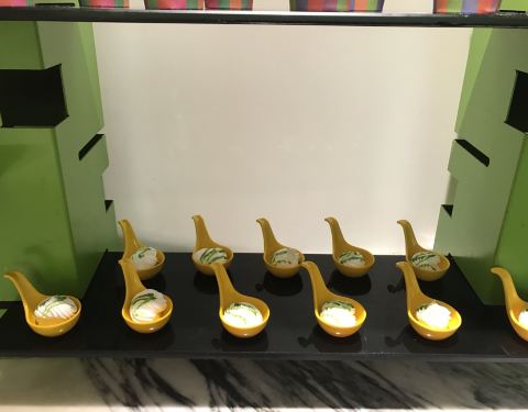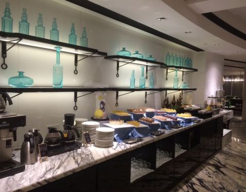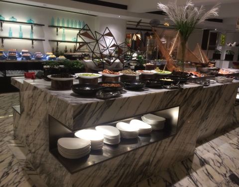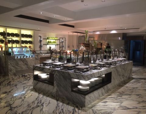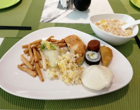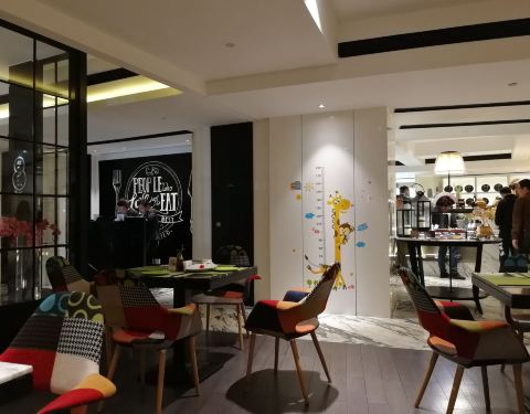 位于富邦大酒店的首层,从大堂正门直进里面便是。不同于传统的豪华型酒店,这里的装修比较轻快,墙壁上的格子摆放着各种可爱的装饰品以及图书,餐厅的环境与卫生也很好。我们享用的是入住包含的自助早餐,品种丰富,还有宁波特色小吃,餐具的造型也好有特色,不过水准较为普通,缺少了点大厨风范。