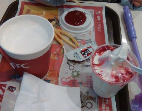 天气真的太太热了000000!下班了经过kfc讲来吃冰!手机点餐,发现惊喜-直没机会吃到的海盐冰淇淋又有了!000立马下单!再来一杯雪顶咖啡!可能时间还有点早,点完立等可取。看看这天气有多热,雪糕在店内都开始融化) (而且内心吐槽,柜台小姐姐卷得很不美) ,所以必须要立刻干掉。海盐出来其实已很久,可不知道为什么总无缘吃上一口,就为了它的颜值,一直心心念念在心里,今天得以品尝,并没有想象中的那么好,能吃到很淡很淡的咸,雪糕不够细滑,可是外层的筒皮很脆,总体来说颜值挑梁无功无过,心里安慰:总算吃过了