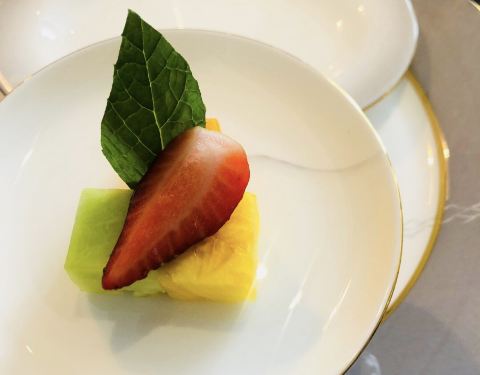 程府宴,餐厅特调的玫瑰茶,与茶杯茶盏琴瑟和鸣 水果小碟,琥珀桃仁与烤杏仁为小食。 餐具源自唐山骨瓷,画意叠翠,细节做足。 开胃四小碟:炸猪皮朝鲜泡菜、椒盐三文鱼丸、糖桂花番茄、牛肉芝麻条 随后的重头戏呈现得极富画面感:牛肉小烧饼、酥饼卷肘子、虾肉烧卖、像极了土豆的素包、玫瑰酥饼、萨其马、红豆山楂糕与枣泥梅花酥。宫廷范儿铺陈而开 杏仁豆腐上有糖桂花洒落的清新,枣泥雨花汤圆里浸润着中式甜点的净雅。最后收尾还有一碗花雕鸡汤云吞,暖心暖胃,悠然乐音。