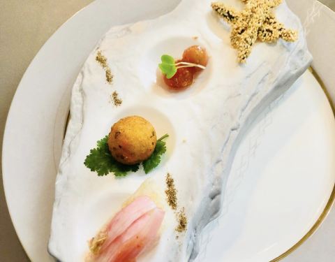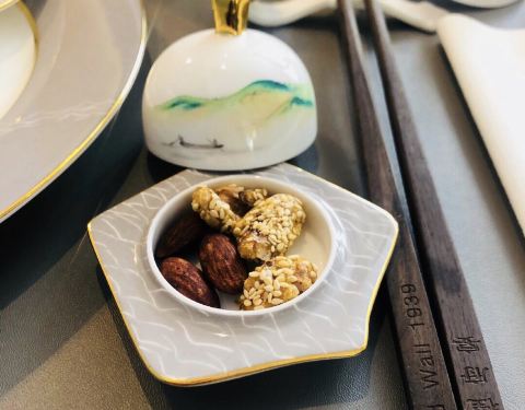 程府宴,餐厅特调的玫瑰茶,与茶杯茶盏琴瑟和鸣 水果小碟,琥珀桃仁与烤杏仁为小食。 餐具源自唐山骨瓷,画意叠翠,细节做足。 开胃四小碟:炸猪皮朝鲜泡菜、椒盐三文鱼丸、糖桂花番茄、牛肉芝麻条 随后的重头戏...