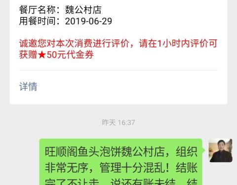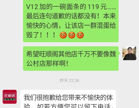 旺顺阁鱼头泡饼魏公村店,组织非常无序,管理十分混乱!结账完了不让走,说还有账未结,结果我是V5的客人,他们让我结V12加的一碗面条的119元……最后连句道歉的话都没有!还收100元包间费![发怒][发怒][发怒]