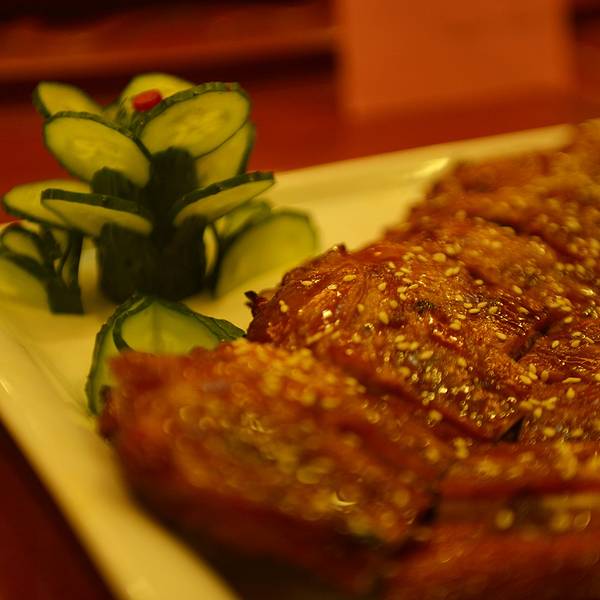 名字叫园林美食,里面环境也确实挺有园林feel,点了烧排骨,荷叶蒸肉丸,炒小黄瓜,排骨烤的刚刚好,不会太干,肉汁锁住,肉丸子坚坚韧韧,不会削,小黄瓜也很嫩,唯一不好就是上菜速度太慢了