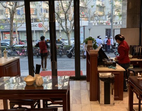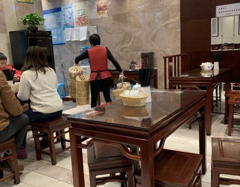 今天撞大运了。大老远跑去吃无锡小笼,下午三点半竟然已经卖完了。老板娘说等半小时会有。小笼还堵在路上。顺丰冷链的车子今天晚到了。店里已经没有原材料了,只有馄饨。我是三点三刻左右下单的。等到四点半左右,顺丰终于来了。见图一,门外那群人围着货车正在卸货。图二三,店员们正在搬货。五点,终于吃完现包现蒸热气腾腾的小笼和小馄饨走人。老板娘很会做生意。在等小笼期间,她让服务员给每位客人都送枣子茶。我觉得她家的枣子茶味道很好喝。等小笼期间还发生了件有意思的事情。不识字的文盲到店里来应聘,老板娘给她每个月三四千块,做扫地阿姨,她还不愿意。这年头劳动力成本上升,连文盲都这么值钱了!还是人民币太不值钱了呢?