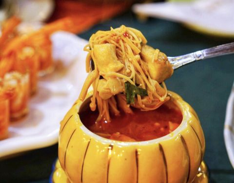 金象湾金榜店,吃泰国菜,冬阴功和咖喱鸡肯定是必点的。冬阴功装在可爱的南瓜盅里,讨巧又诱人,喝一口汤,酸酸甜甜暖到心里。咖喱和肉类是绝配,浓郁微辣的咖喱和嫩滑的鸡肉,让我不由多添了一碗米饭。泰式烤牛...